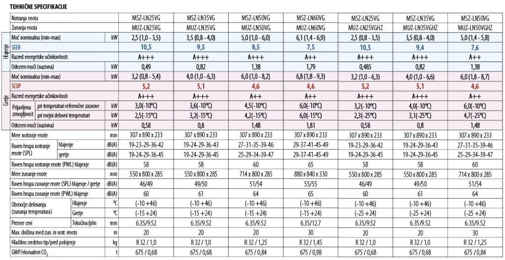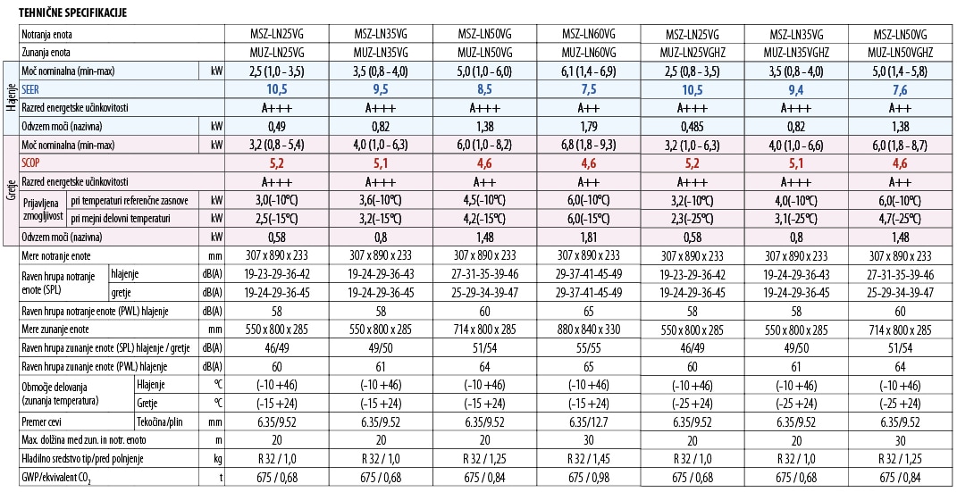 - stenska notranja enota MSZ-LN v kombinaciji z modeli zunanjih enot MUZ-LN VGHZ